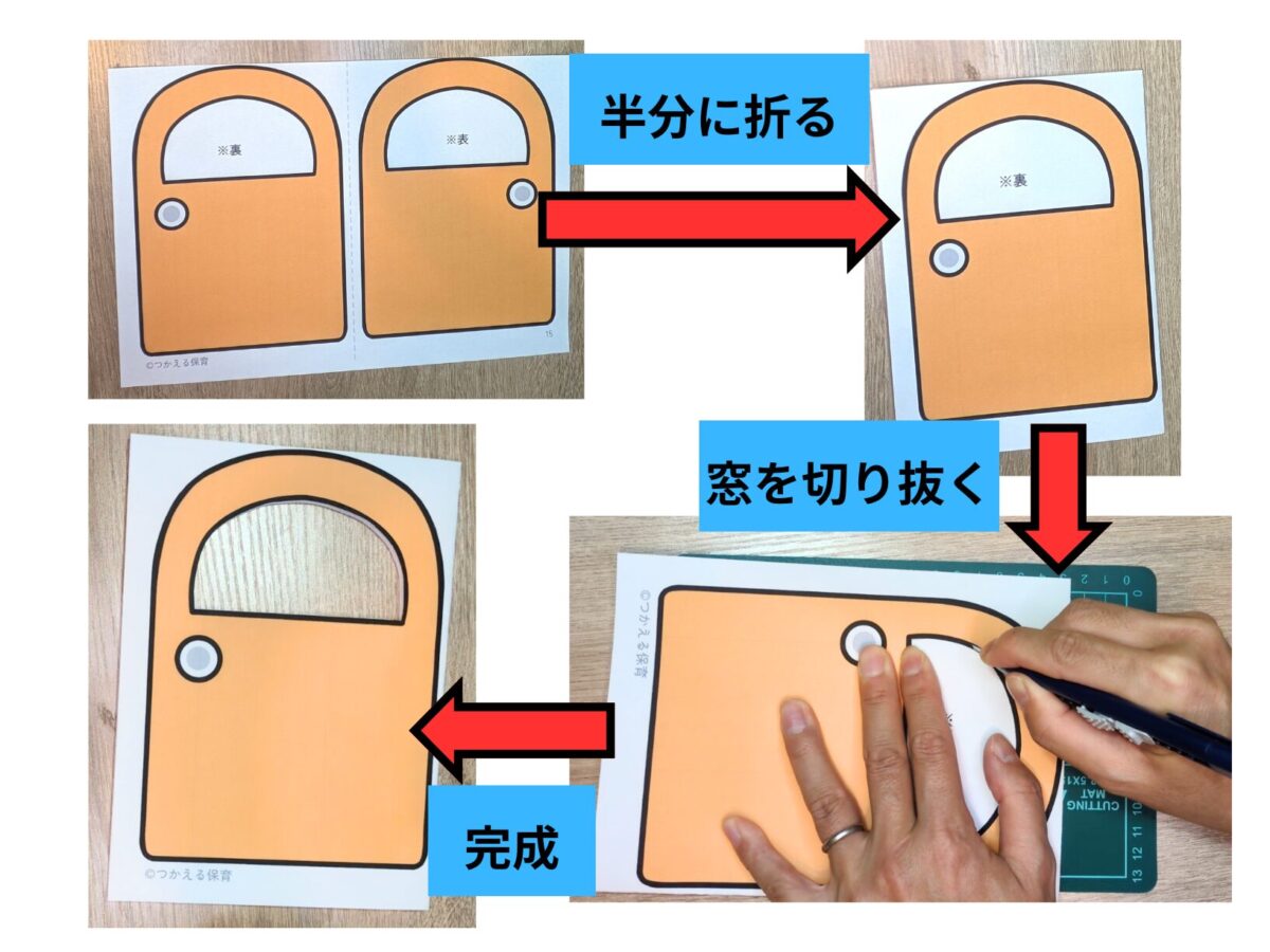 次に、「イラスト15のドア」を半分に折って、カッターで窓をくり抜きます。