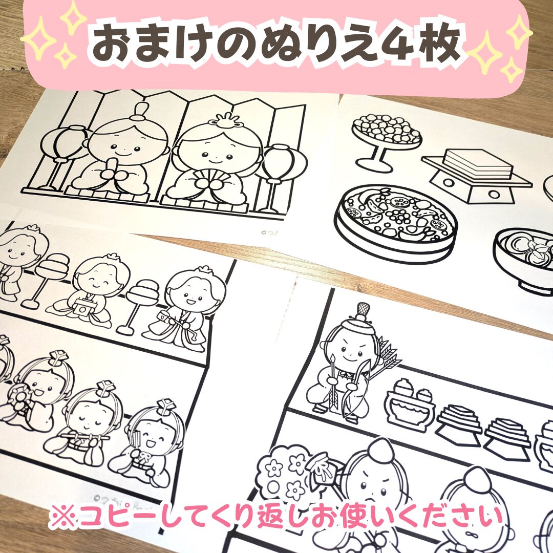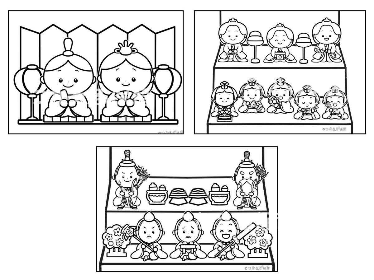 ひな人形のぬりえは3種類あるので、全部ぬれば『自分のおひなさま』の完成です。